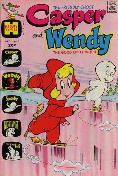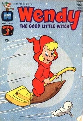 Wendy the Good Little Witch is a fictional comic book character from Harvey Comics, making her debut as a back-up feature as well as a companion for Casper in Casper the Friendly Ghost #20, May 1954. Soon, she was trialed in Harvey Hits, starting with #7. After a total of six appearances, she received her own title, Wendy the Good Little Witch, in 1960. Other ancillary titles featuring the pleasant young witch include Wendy Witch World (October 1961 - September 1974), and Casper and Wendy (September 1972 to November 1973). Another Wendy the Good Little Witch comic ran from April 1991 to August 1994, and a three-issue Wendy and the New Kids on the Block saw print in 1991.